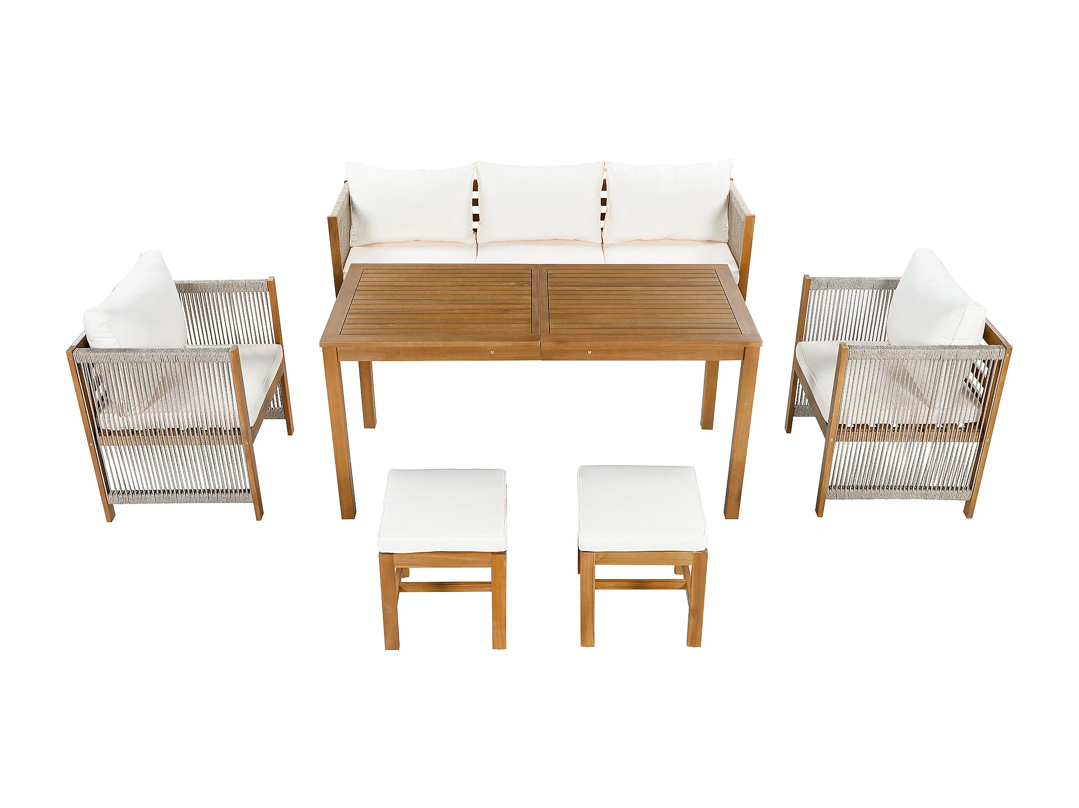 Zestaw ogrodowy 6-elementowy - sofa 3-osobowa + 2 fotele + 2 hokery + 1 stół - akacja - beż