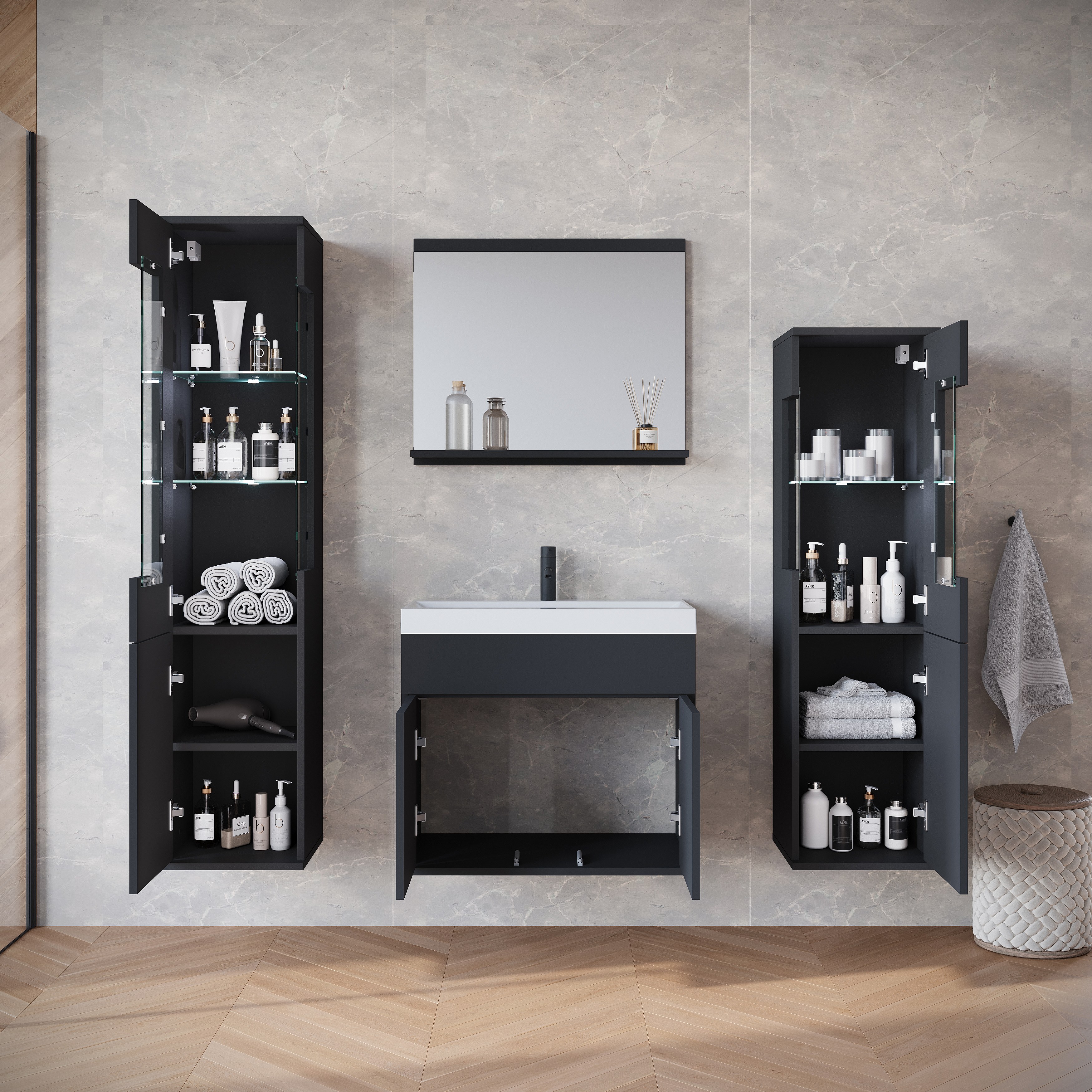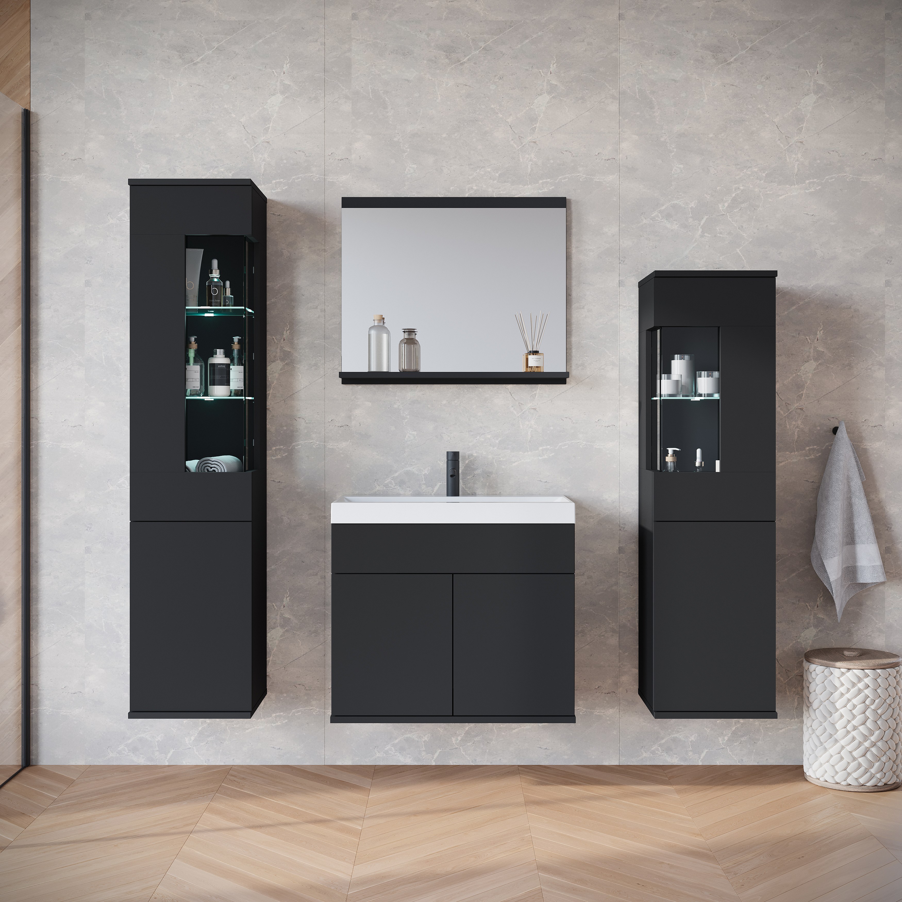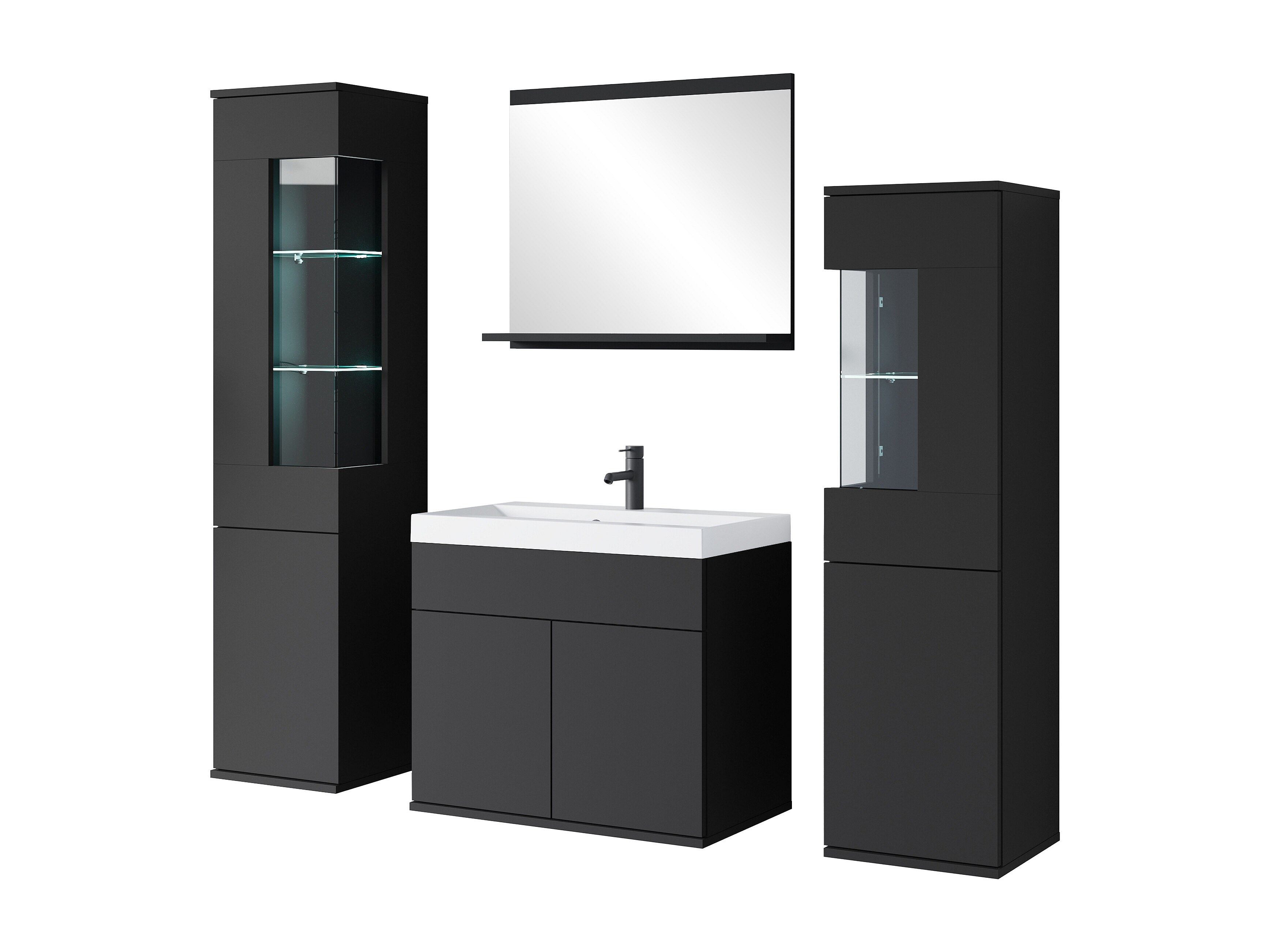Zestaw mebli łazienkowych, komplet wiszący z umywalką, lustrem i 2 słupkami, czarny mat