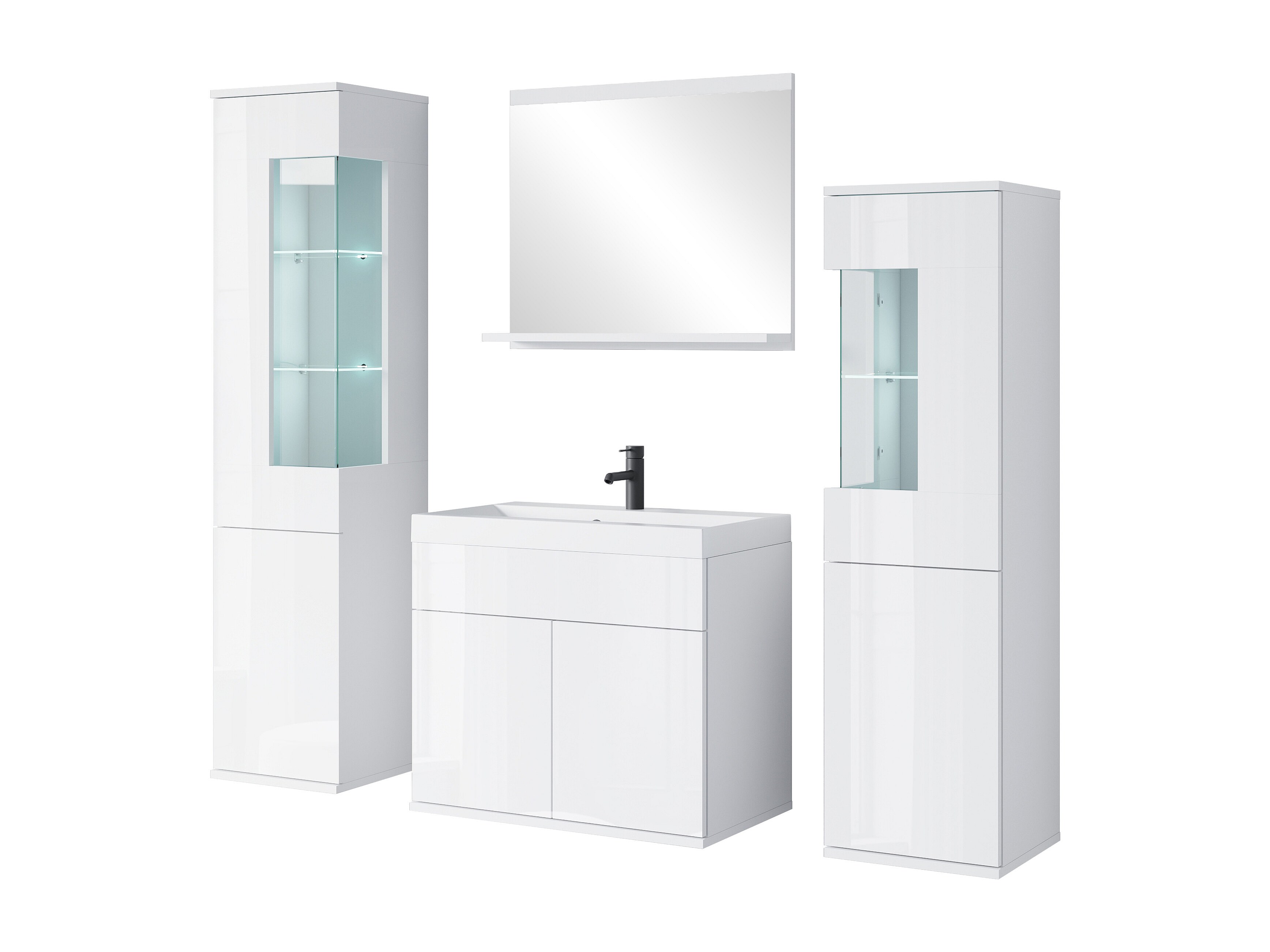 Meble łazienkowe, zestaw wiszący do łazienki z umywalką, 2 słupkami i szafką lustrzaną, korpus biały mat / fronty biały połysk