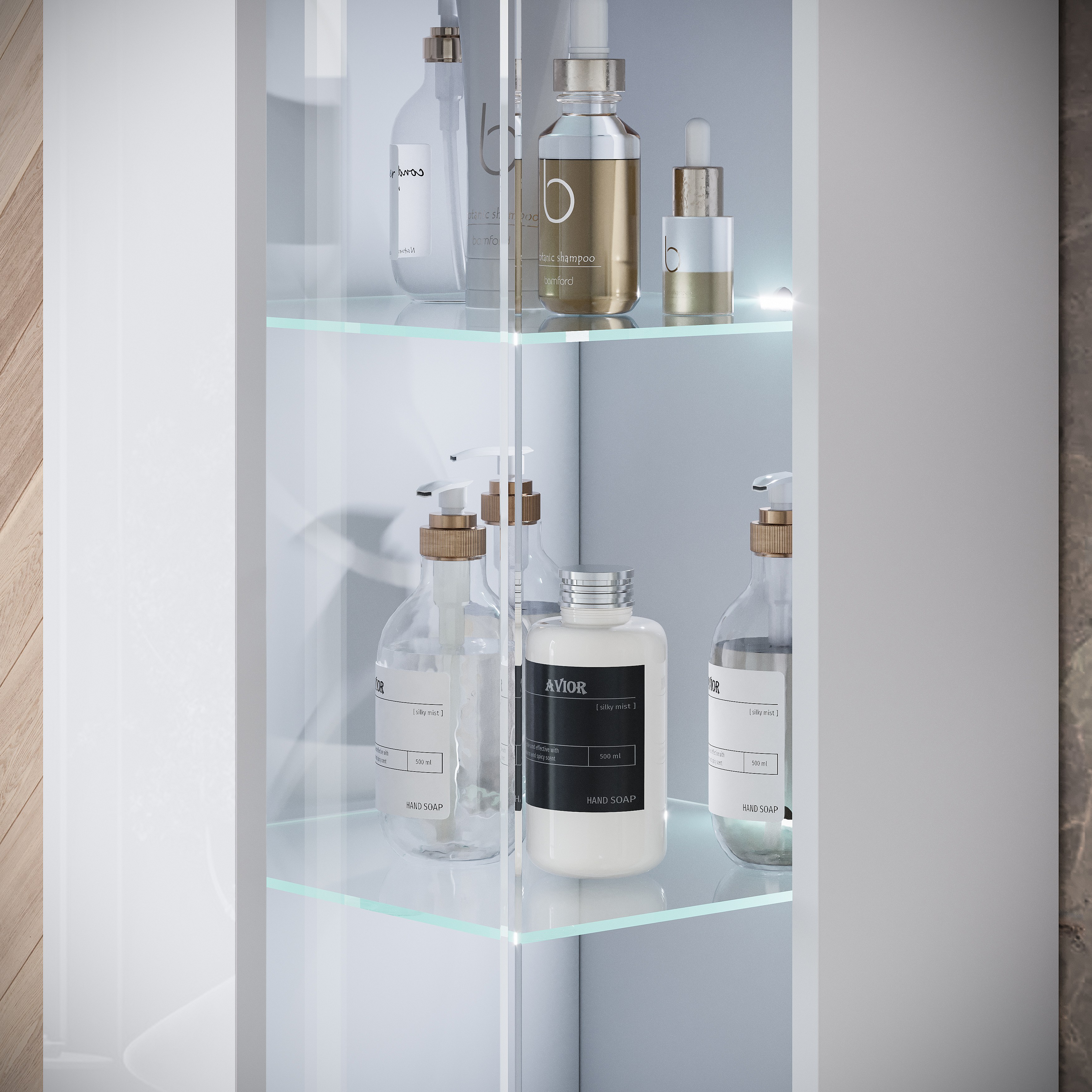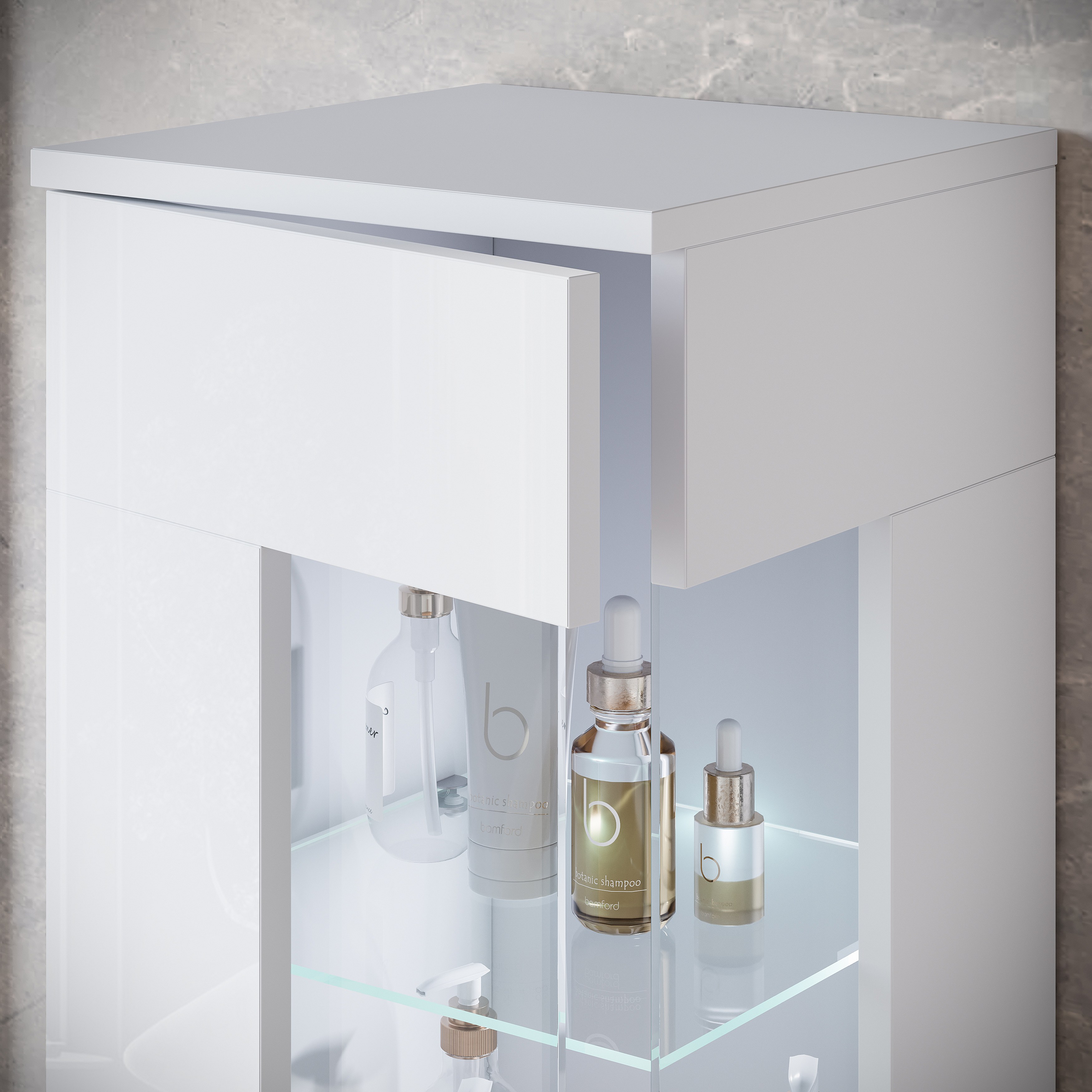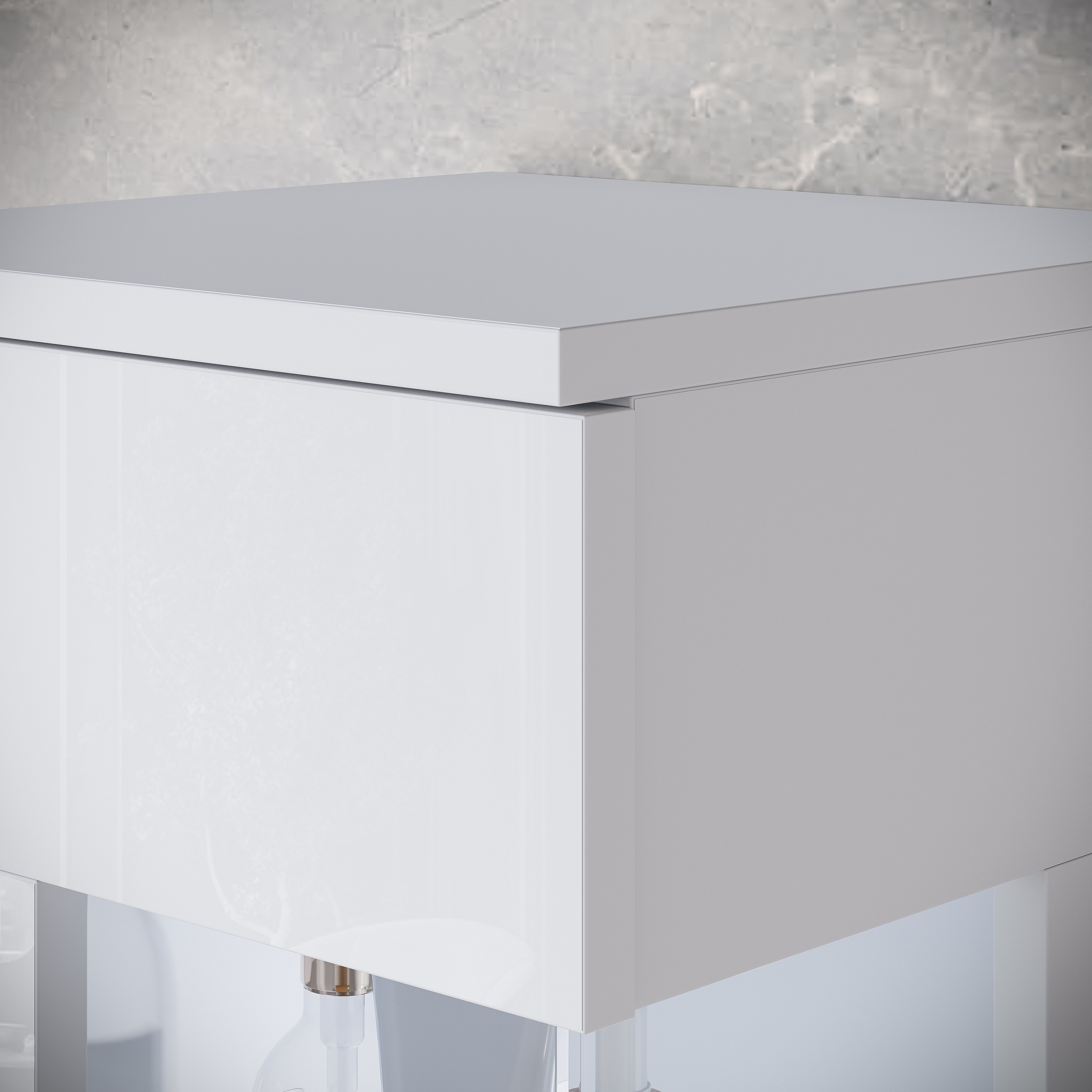 Zestaw wiszący z umywalką, lustrem i szklanymi elementami, korpus biały mat, fronty biały połysk