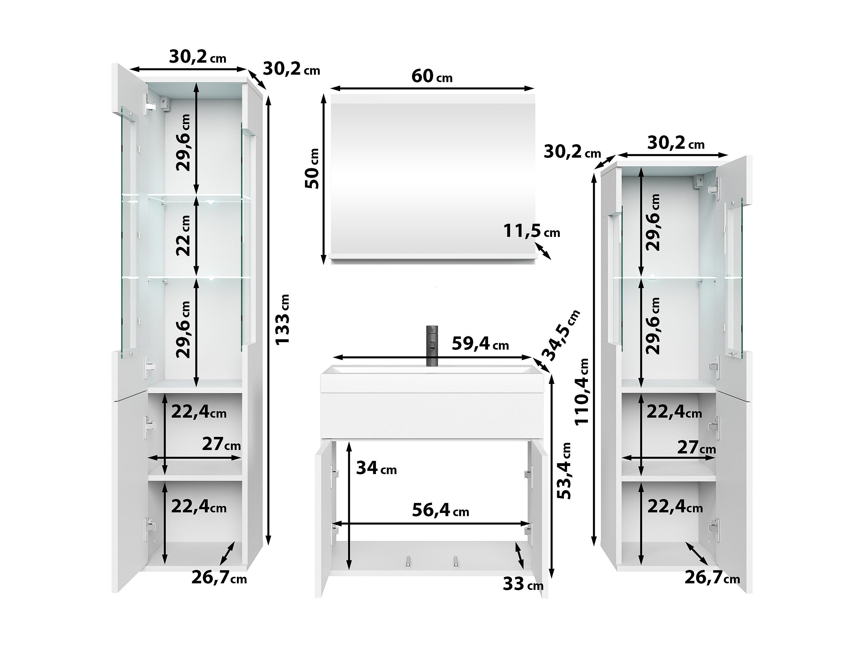 Zestaw mebli łazienkowych, komplet wiszący z umywalką, lustrem i 2 słupkami, korpus biały mat fronty biały połysk