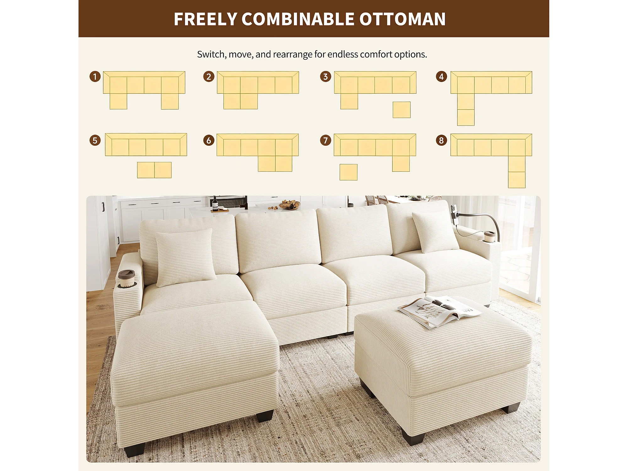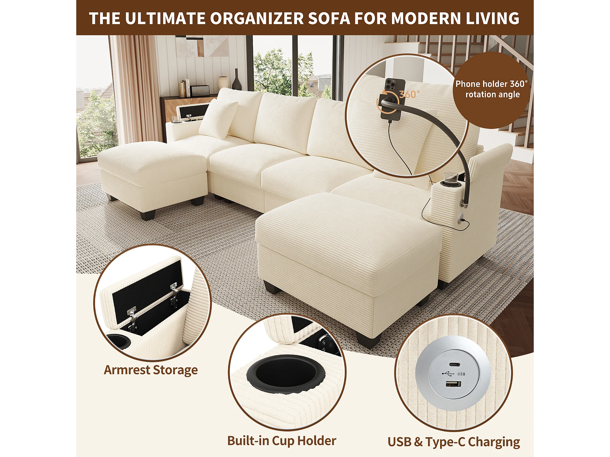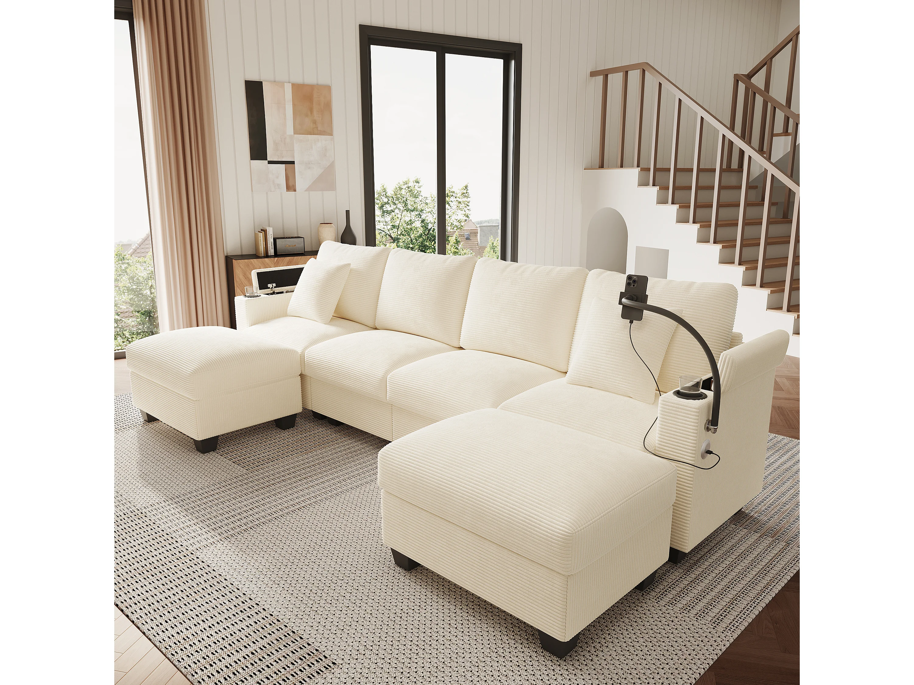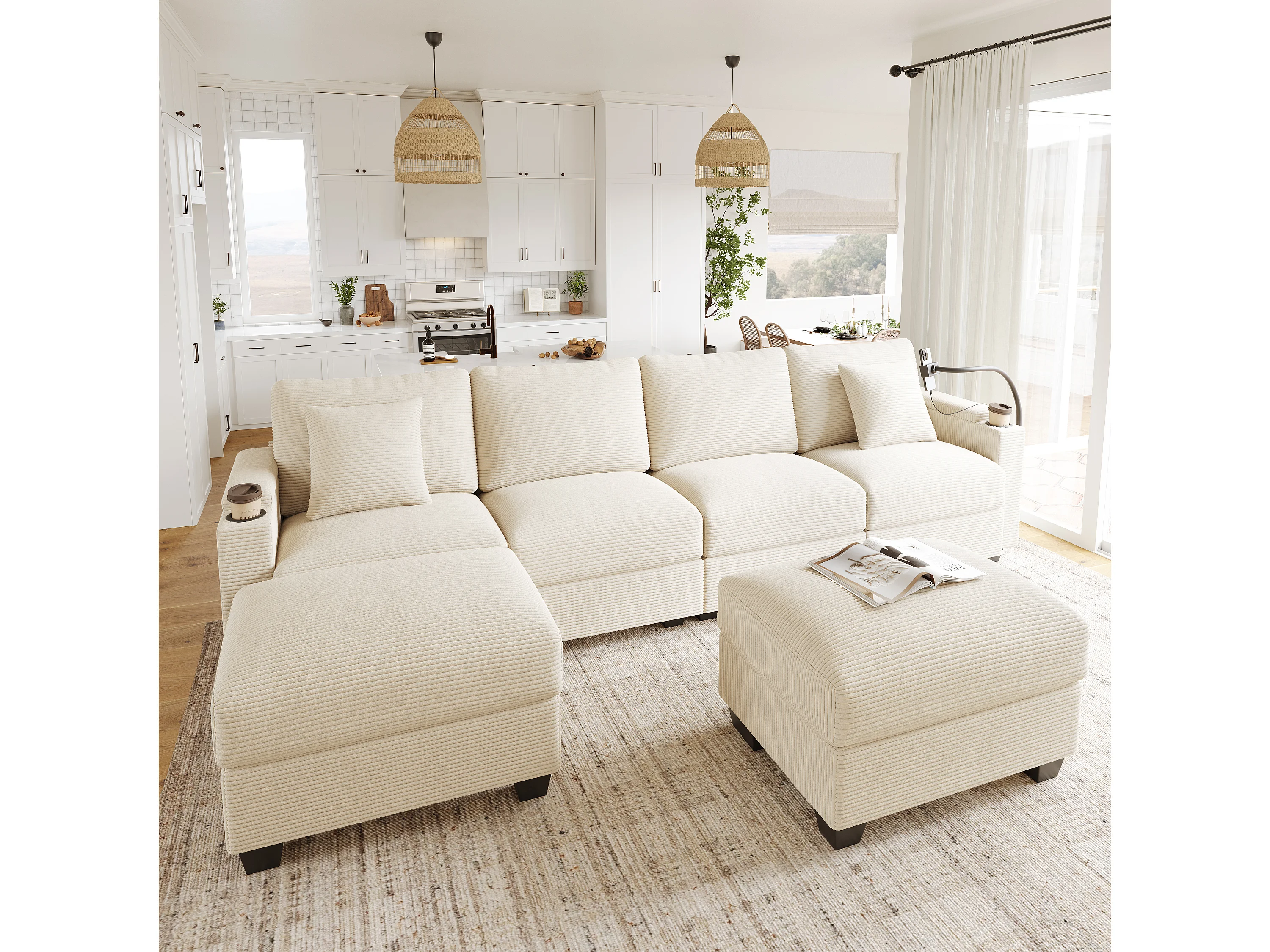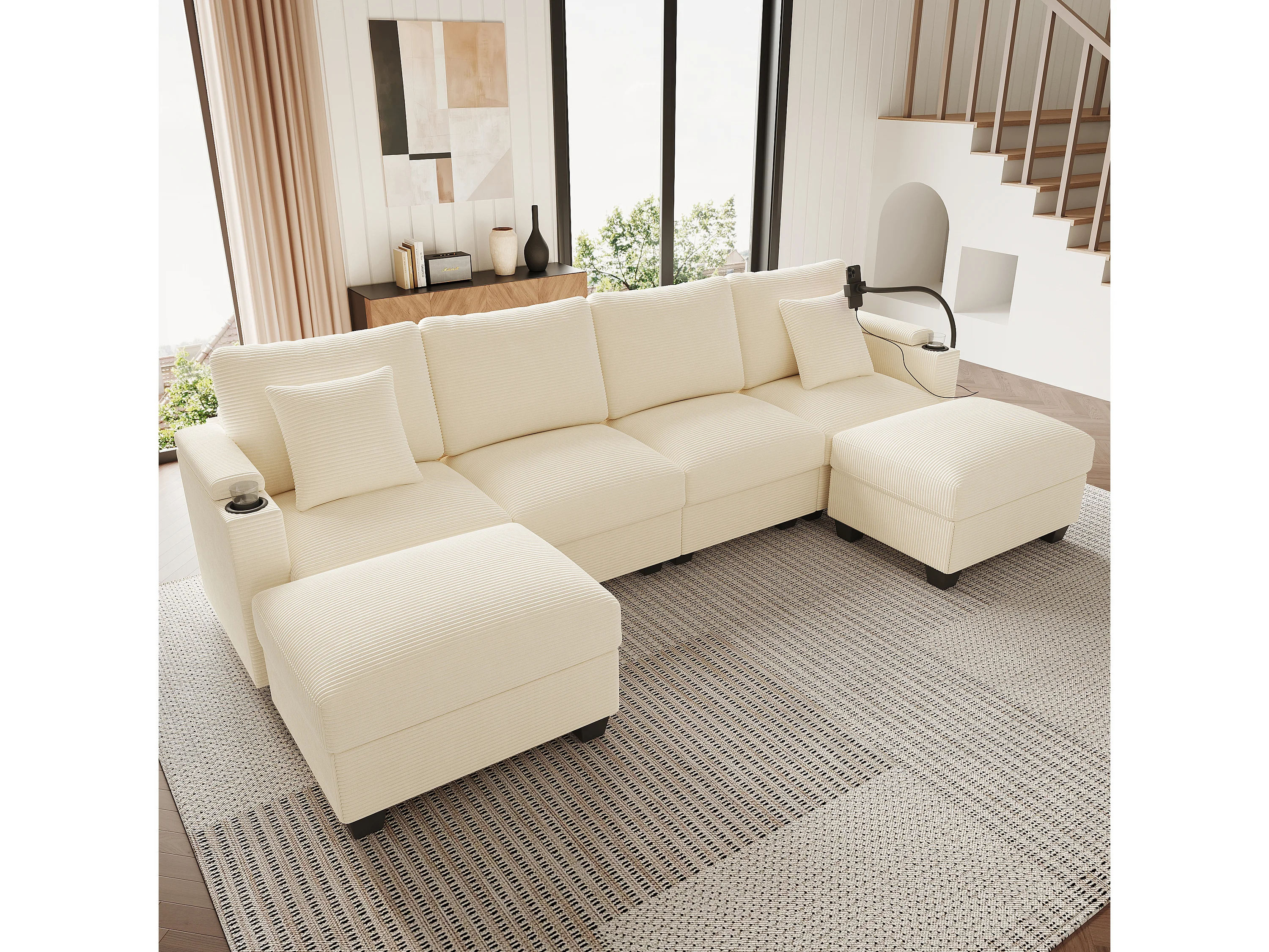 Zestaw wypoczynkowy w kształcie litery U, 4-osobowy - 275,5 x 139 x 87 cm - z podnóżkiem + portem USB + schowkiem - aksamitny - beżowy