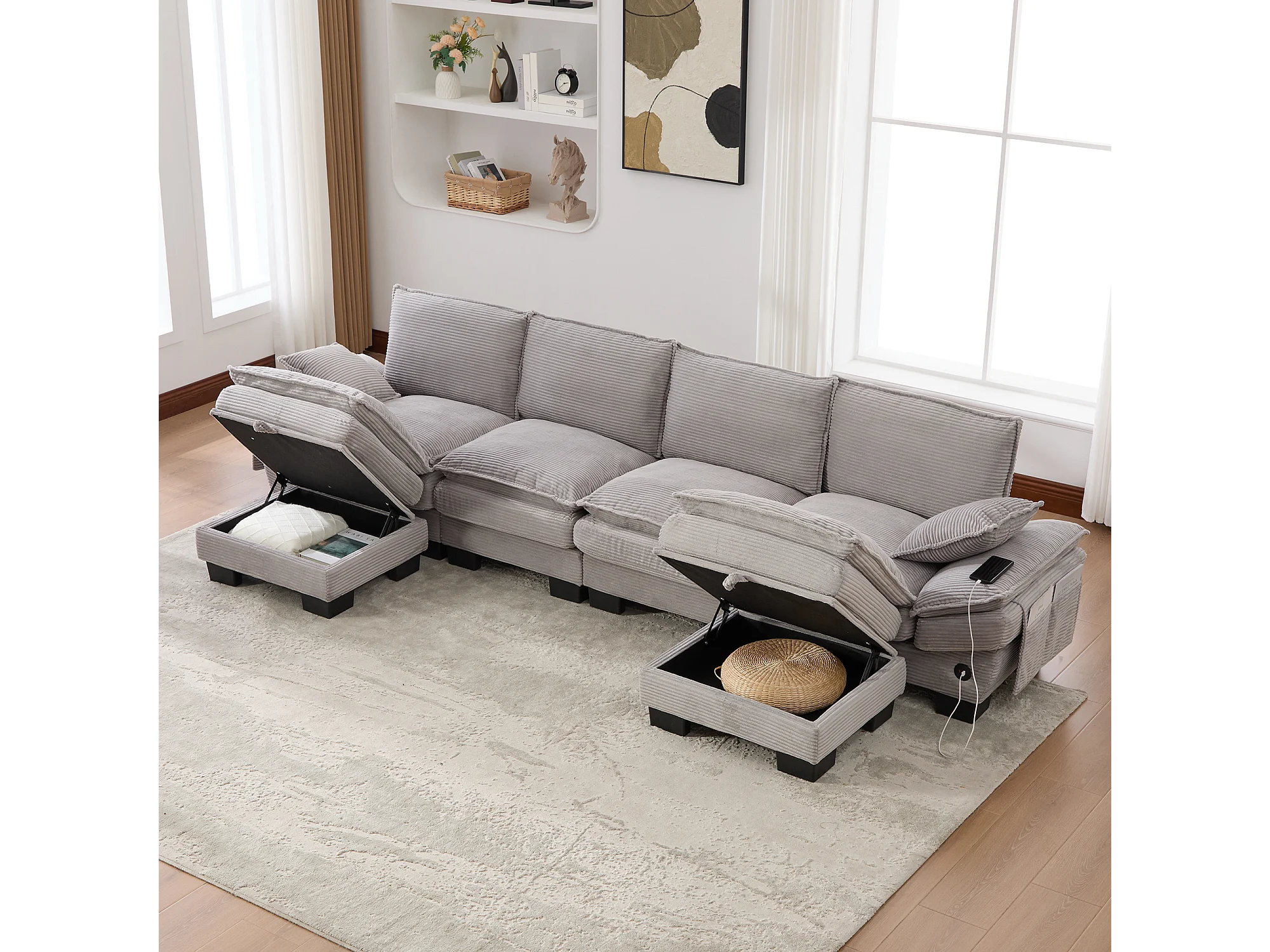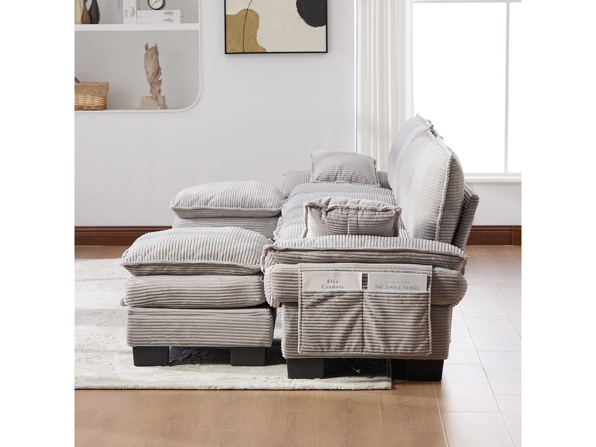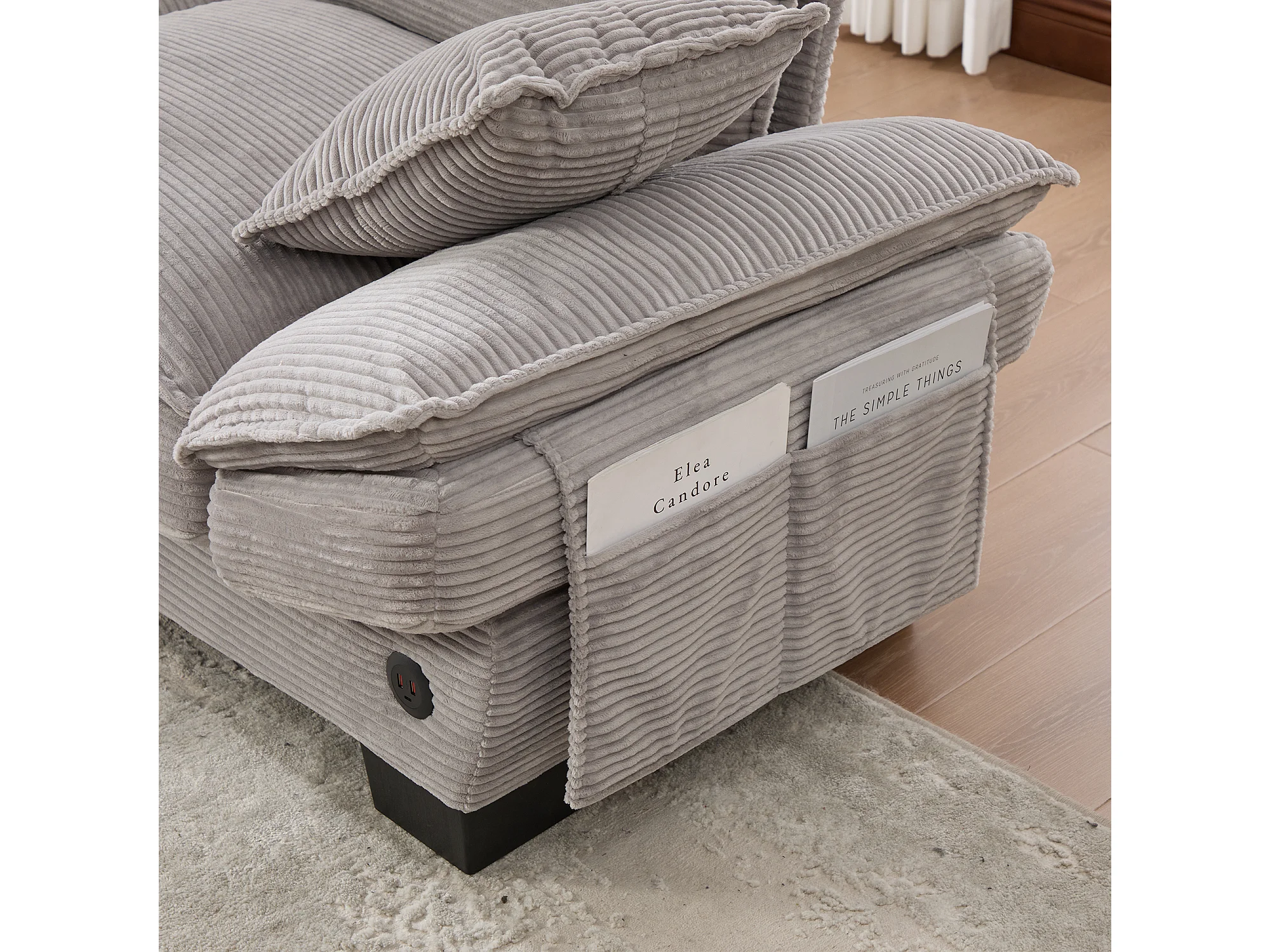 Zestaw wypoczynkowy z tkaniny sztruksowej dla 4 osób - 330 x 132 x 84 cm - z 2 pufami ze schowkiem + port USB + kieszenie - szary