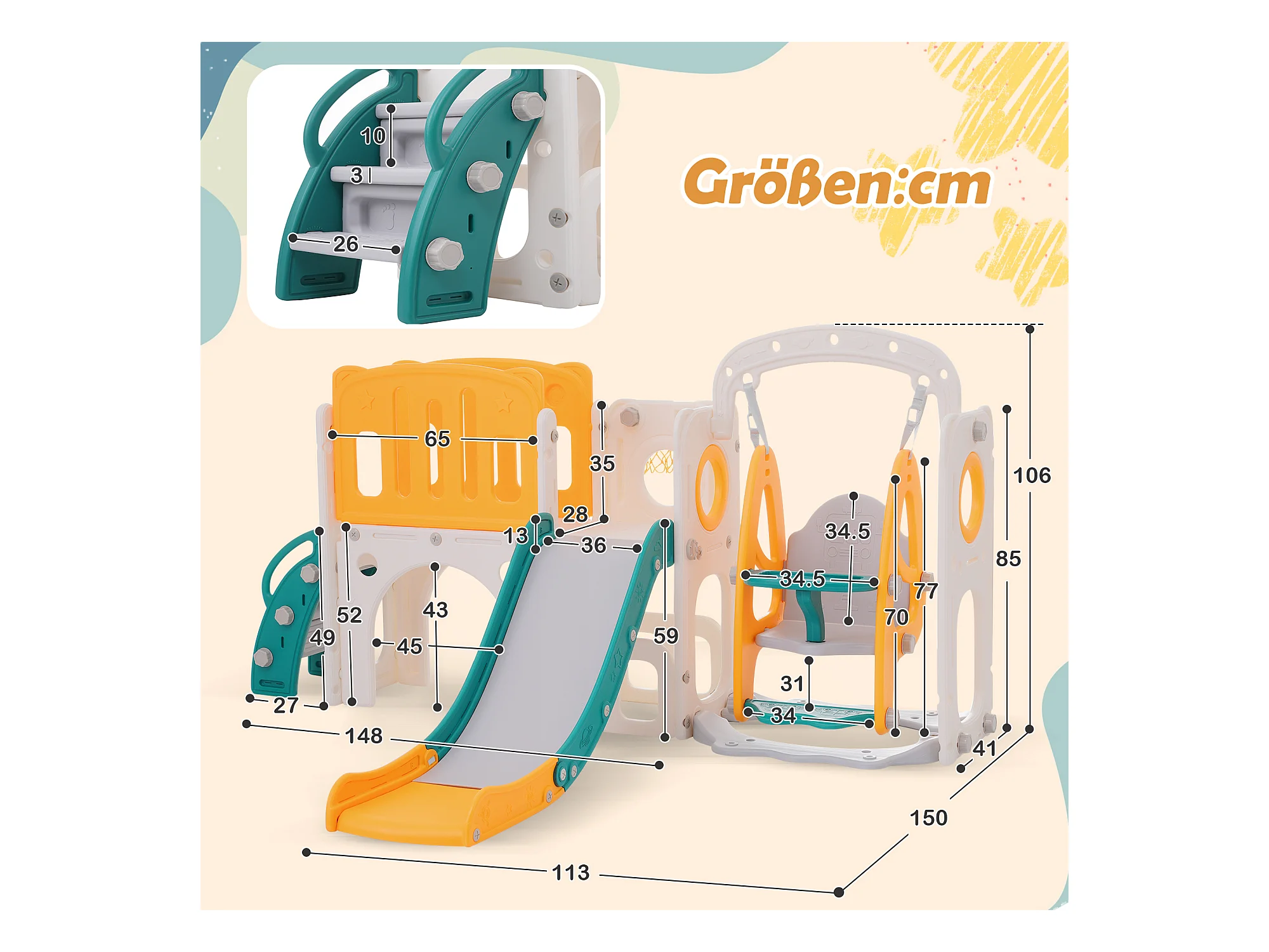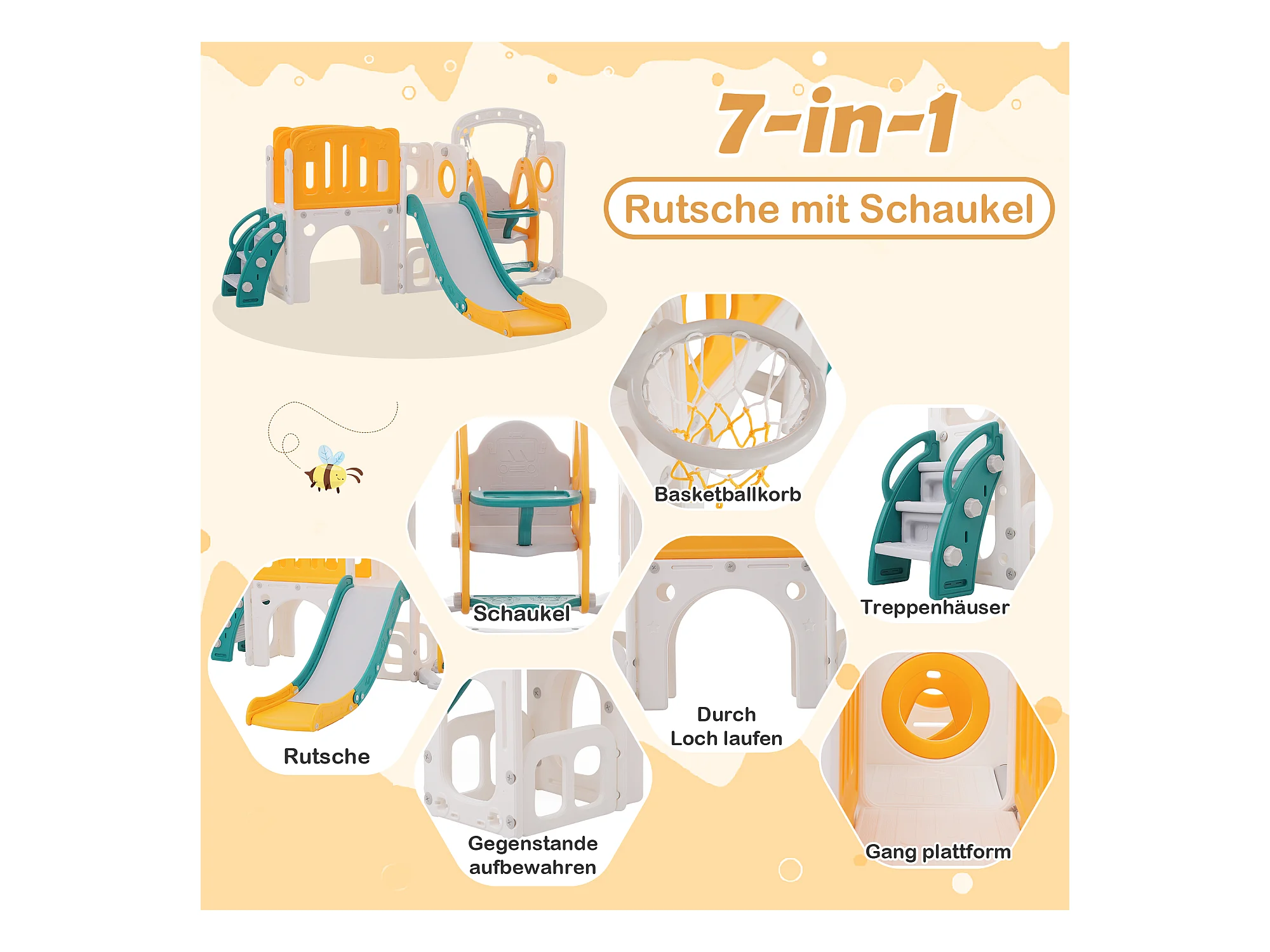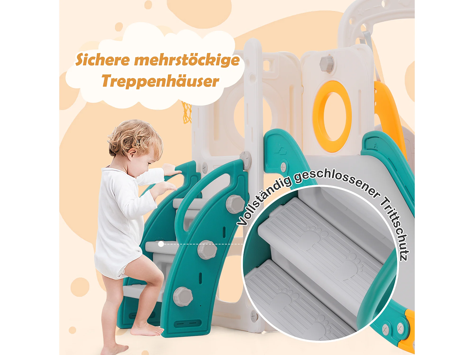 Zjeżdżalnia 7 w 1 dla dzieci - 215 x 150 x 106 cm - HDPE - z huśtawką i koszem do koszykówki - Zielony